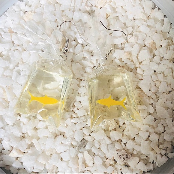 Fun pet fish earrings. Bold and cute. Make from plastic baggies, resin and little fishes. Handmade. 2 inches long. .75” wide