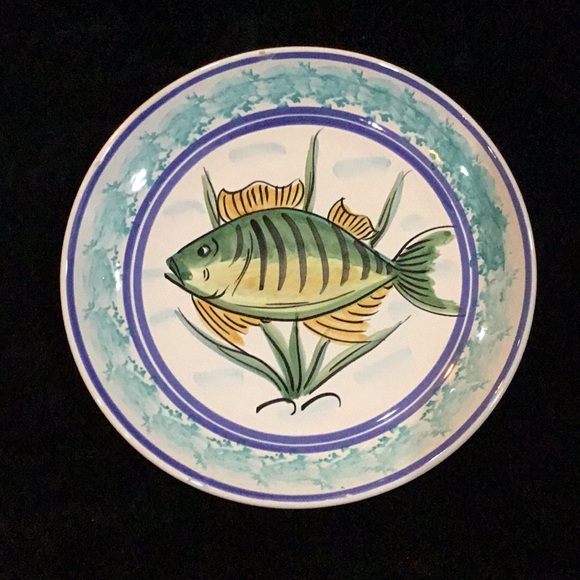 15” x 14 1/2” serving plate with fish detail for decoration or actual serving. Has only been used for decor. Small chip at top is pictured. Porcelain