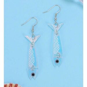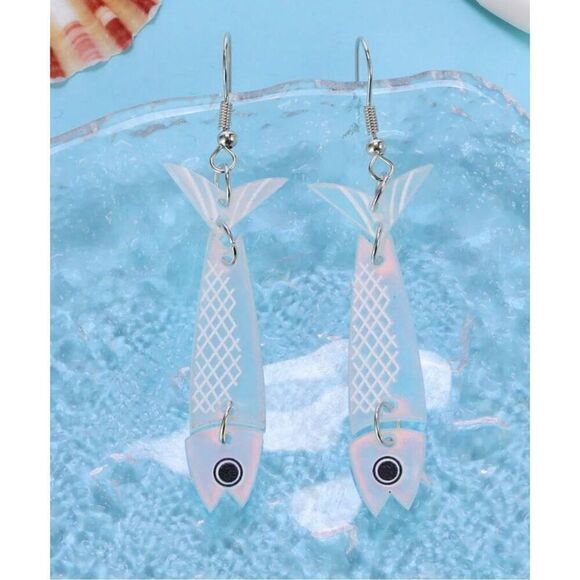 Adorable iridescent blue acrylic fishhook fish pierced dangle earrings. These little gems are sure to spark a smile and start a conversation.