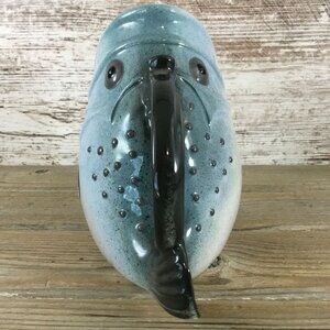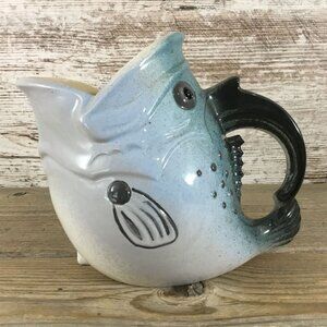 A decorative and functional ceramic pitcher with a fish-shaped design, ideal for adding a whimsical touch to kitchen decor or serving beverages. California Pottery possibly?