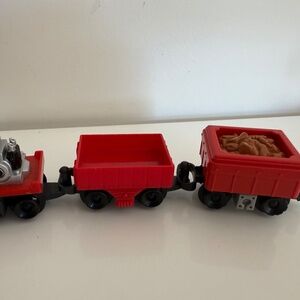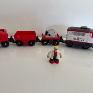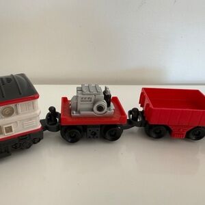 Super cool GeoTrax by Fisher Price! This is the white and red train set with a bonus car. Smartest Team featuring Goggles & Bunsen. Push train, but the engine lights are untested. That said, the set is in good shape with minimal signs of play wear (couple of small signs...refer to the pictures). Includes the engine, three cars, and figure.