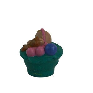 This adorable Fisher Price Little People set features two baby girl figures with a teddy bear sitting in a white and green basket respectively, perfect for imaginative play.