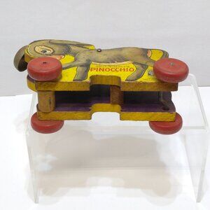This delightful vintage 1939 pull toy features a charming illustration of Pinocchio's Donkey "Lampwick" by Walt Disney. Crafted by Fisher Price, it boasts a classic wooden design with vibrant colors. The toy includes a ringing bell and sturdy red wheels, making it a nostalgic piece that evokes the whimsy of childhood.
