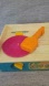This vintage Fisher-Price toy is the Music Box Record Player from 1987. It's a wind-up record player with plastic records that really play music. Just wind up the crank on the front of the box, put on a record, place the arm over the record, and it will work like a music box. Small bumps and grooves on the record catch the music-player attachments in the arm and have a beautiful chiming sound.