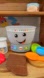 Smiling bowl with alphabet design. Includes measuring cups, spoon, and play food. Excellent condition.