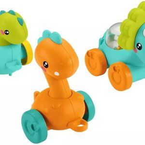 Get baby's gross motor skills chugging along with the Fisher-Price® Paradise Pals™ Dino Choo Choo Trio! This push-along toy train is made up of three dinosaur-themed vehicles, each with its own fun busy activity for little ones to explore. As your baby rolls the dinos along, they each come to life with fun actions, including popping rattle beads, head-bobbing, and spinning. Push them along on their own, or link them all together to form a super cute dino train for your baby to crawl and chase after! Dinosaur-themed push-along toy train with 3 individual dino vehicles Roll each dino along for fun actions, including popping rattle beads, head-bobbing action, and spinning Baby can grasp and roll the dinos individually or link them together to form a dino train Helps strengthen fine and gross motor skills as baby grasps, rolls, and crawls after the vehicles For infant and toddler dinosaur lovers ages 6 months and older What's in the Box 3 dino vehicles