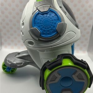 Fisher-Price robot with interactive features. Bright green wheels and black accents. Encourages learning and play. Used condition.