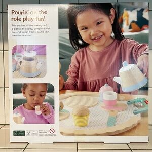 This charming tea set is crafted from high-quality wood, ensuring durability and safety for little hands. The vibrant blue and pink colors add a touch of whimsy, while the detailed design encourages imaginative storytelling and social interaction.