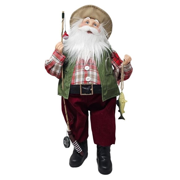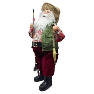 He's got red pants with a black belt and a warm plaid shirt. He's holding a fishing pole with bobber and reel in one hand and a fish that he's caught in his other hand. He's tucked some spare fishing line into his fishing vest pocket. He has black plastic boots and stands independently. Santa's hands and face are plastic.