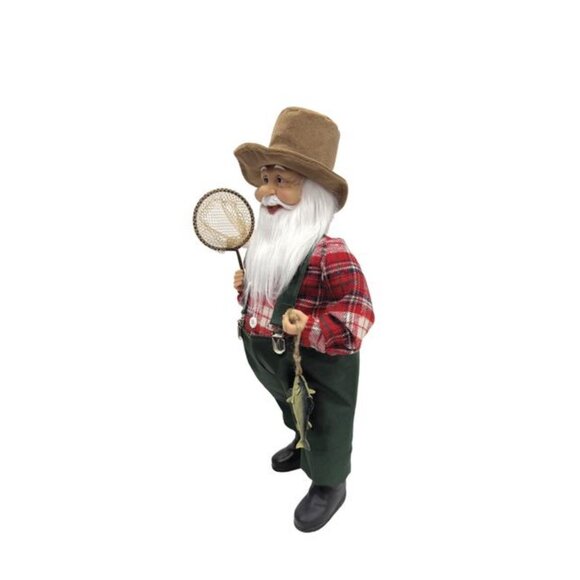 Celebrate the outdoorsman spirit with this 18-inch Fisherman Santa figurine, dressed in a cozy red plaid shirt, green suspenders, and waders. Santa carries a fishing net and a catch of fish, perfectly styled for cabin, lodge, or rustic Christmas décor.