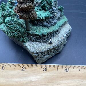 Hand-painted resin miniature cottage on a rocky, landscaped base featuring trees, bushes, flowers, and a pathway