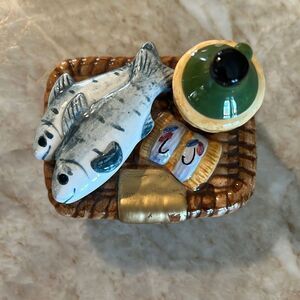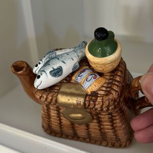 Cute little mini teapot. Disguise like a wicker Fishermans basket. Lid has jug of wine lures and two fish. Excellent condition.