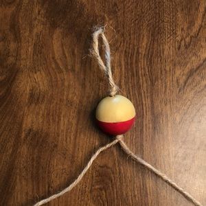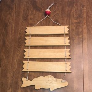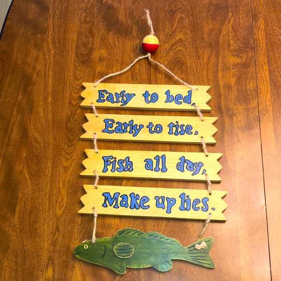 Cute fisherman hanging sign. Adorable bobber top. Hands on a nail or hook. Made of wood.