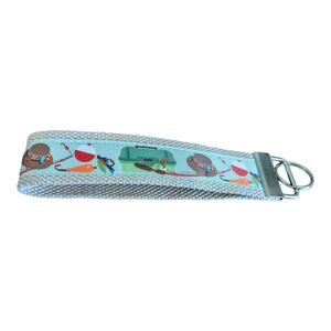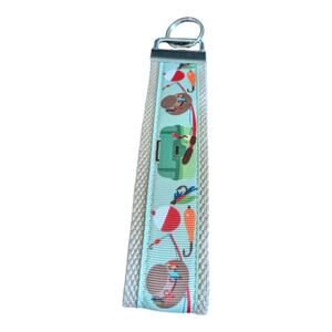 This wristlet features fishing necessities including tackle boxes, hats, rods, lures and bobbers. The khaki webbing coordinates nicely. The hardware and keyring are silver in color.