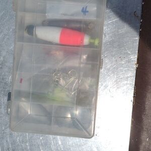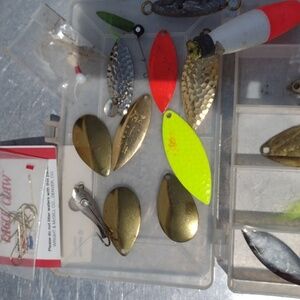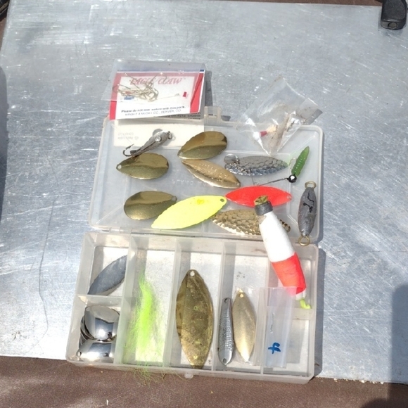 Assorted fishing lures in a convenient box. Includes gold, silver, and red lures.