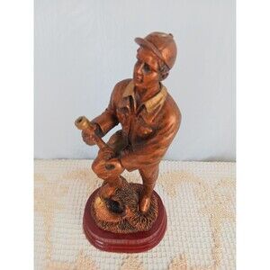 Copper color statue-figurine on a dark burgundy base, portraying a man in his ball cap and casual clothing fishing at the river. He is standing on a small grassy hill, with a fish just caught shown. The fishing pole is missing, otherwise in great condition.