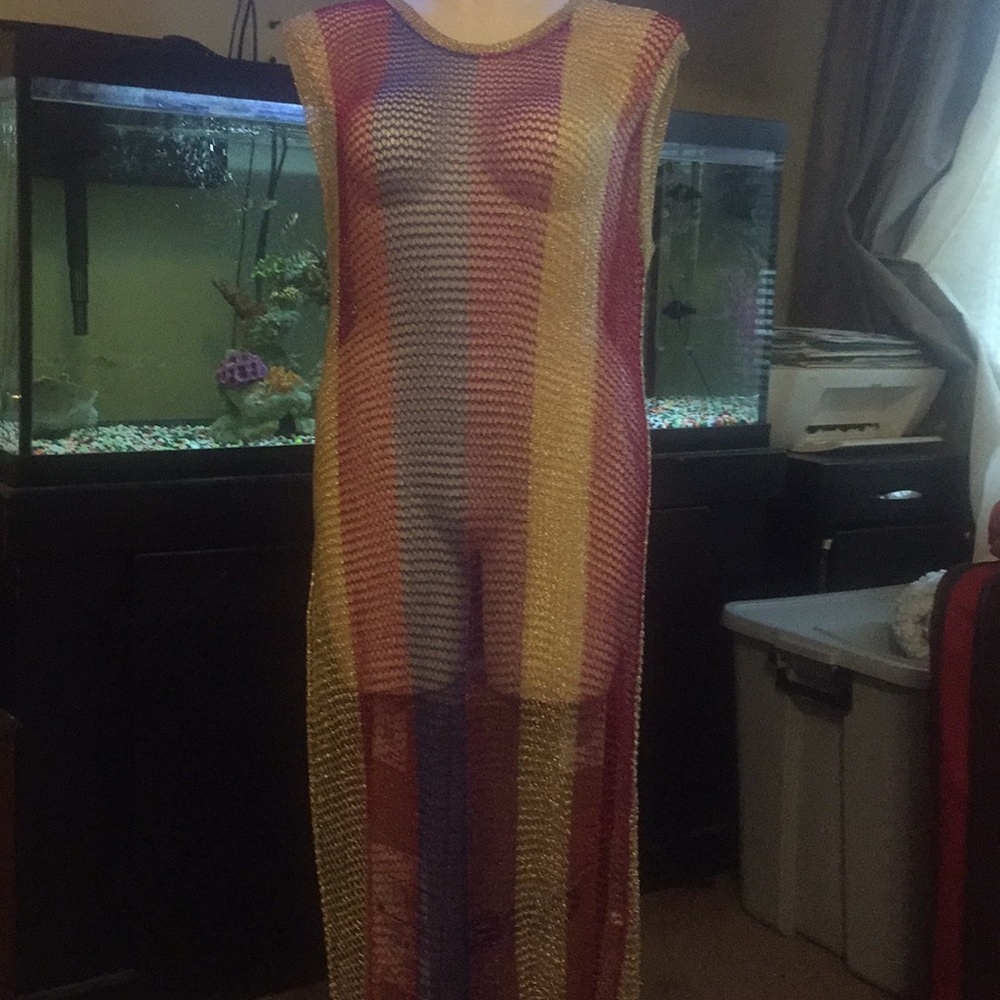 Beautiful sexy multicolored fishnet maxi dress with the split on the side. Can be worn as just a sexy piece at home for entertaining or as a shell on top of a full cat suit or jeans and a turtleneck. Beautiful peaceful night out