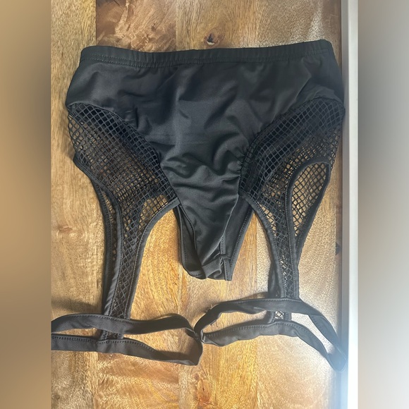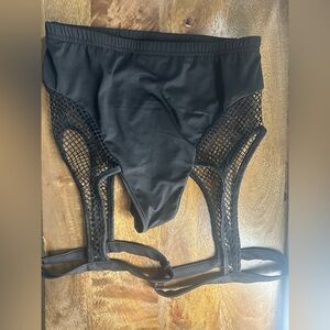 Black fishnet rave booty shorts with garter/leg straps.