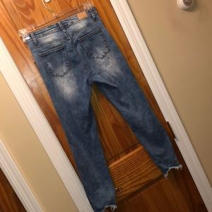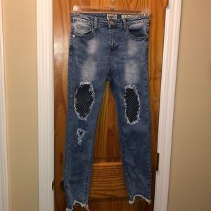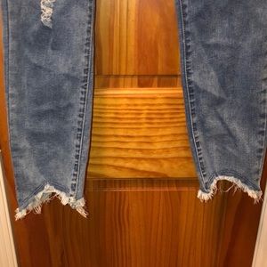 •Skinny ripped jeans that come down right below the knee and above the ankle
