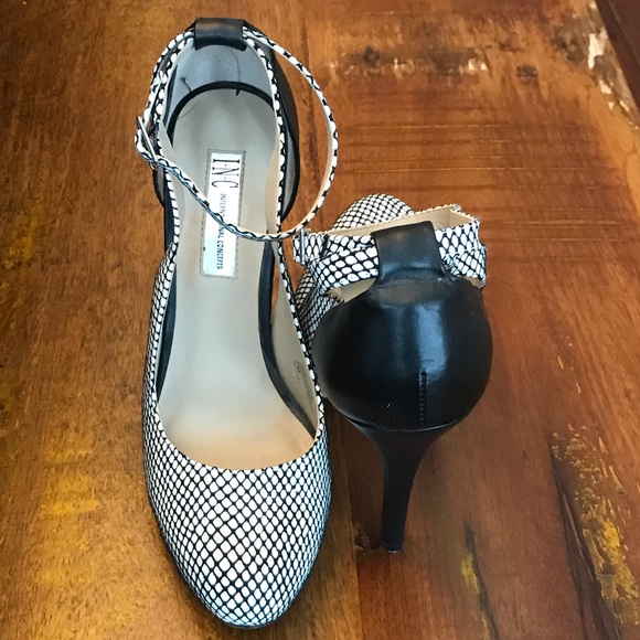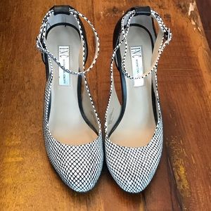 These heels have a fishnet looking pattern with an ankle strap.