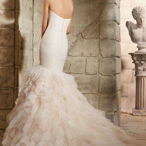 Mori Lee | Madeline Gardner | Bridal Blu5369 Wedding Fishtail wedding gown. Retail price 1KUSD. (after alterations $1680.00 USD). Asymmetrically Draped Soft Net Strapless Gown with Ruffles. Purchased in 2016 and dry cleaned. Tag says size 6 but was altered to fit between a 2 to 4. I wore 4.5 inch heels and my height is 4 ft 11in. The dress was floor length.