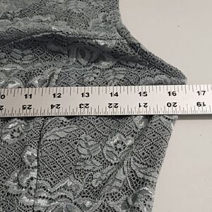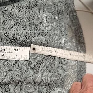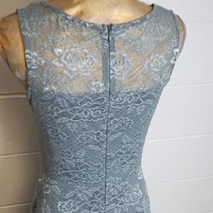 This stunning Grey dress has a hint of silver shine as the light hits it. No metalic trhreads. Features a sleeveless design with a scoop neckline, perfect for a wedding guest. The A-line silhouette gracefully flows to a midi length, offering a timeless and elegant look. Soft Lace, lined.