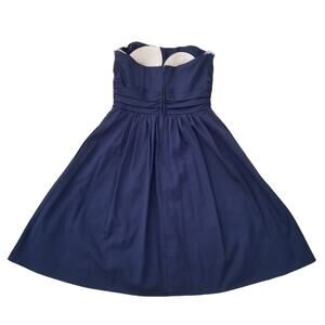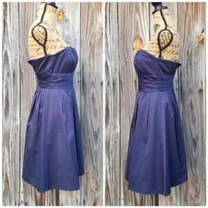Navy blue 100% cotton fabric. Strapless w/ pleated bodice. Fit and flare silhouette w/ ruching band at the waist, full flared skirt. Rear zip, 2 pockets, fully lined. Issues noted in photos. Very good preowned condition, overall. Size 2 by David's Bridal. Style: 83312
