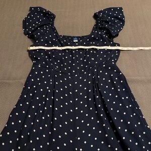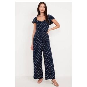 Navy dot jumpsuit. Sweetheart neckline, smocked back, on seam pockets, short flutter sleeves