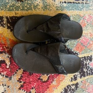 Fit Flop Black Glitter Comfort Thong Platform Low Wedge Sz 10