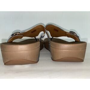 Fit Flop Blue Denim & White Stripe Thong Sandals Sz Us 11 Micro Wobble board. FitFlop Sandals are made with leather and have a toe post. They are biomechanically engineered to complement your body structure, joint alignment, and natural movement. They also have arch support and a super cushioned sole to distribute weight more evenly