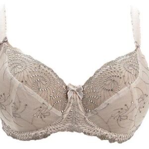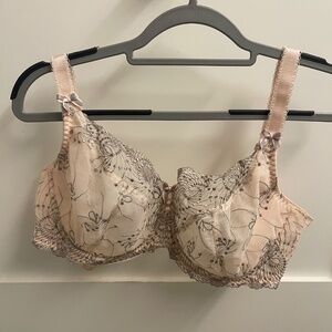 Beautifully detailed contrast embroidery covers the cups and center panel of this fabulous underwire bra. Multi-part, seamed cups perfectly shape full-busted and full figure breasts.