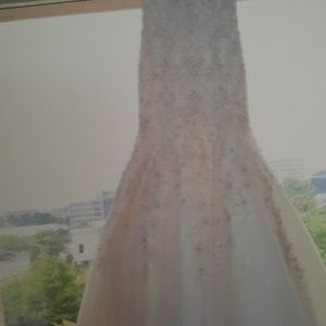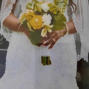 Genuine Private Label by G #1591 wedding dress! This timeless wedding dress features layers upon layers of detail with perfect organza and lace underneath 30,000 sparkling beads. Finished with the illusion of a deep sweetheart neckline and a lace upper with short sleeves This is a beautiful fit and flare dress has a small train and is perfect for your wedding day.