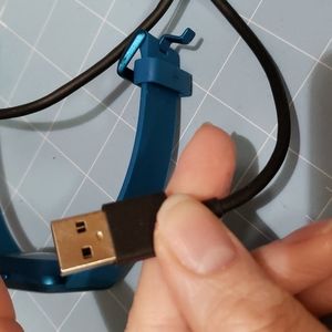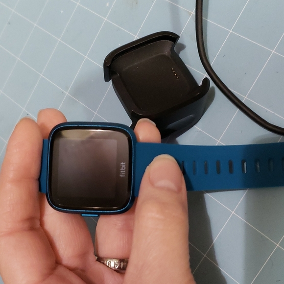 teal blue used a few times. Comes with charger. screen has very faint surface wear and tear. you can barely see it. It does have a chip on buckle(bracelet