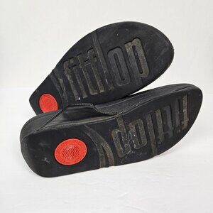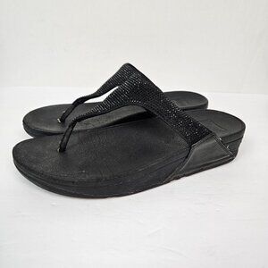 FitFlop LULU Crystal Toe-Post Platform Thong Comfort Sandal in All Black, size 8. Style# EJ8-090. Slip on, flip flop/thong toe post style. Minor signs of wear to toe-post and soles as shown in photos; great pre-owned condition.