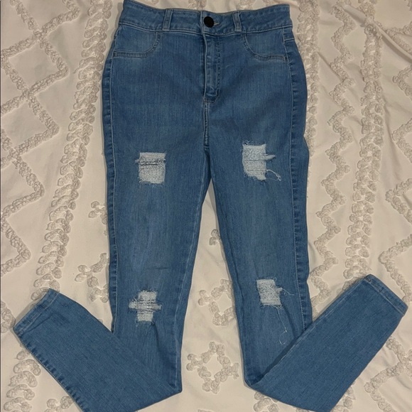 FitJeans trendy light blue skinny jeans with distressed details. Perfect for a casual look.