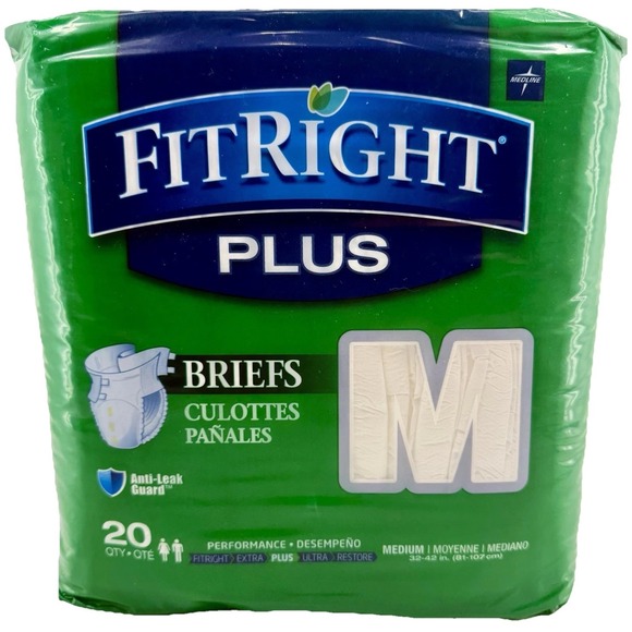 FitRight Plus Adult Briefs Medium 20 Count Pack Disposable Anti-Leak Guard NIP