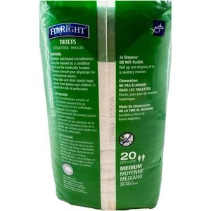 These FitRight Plus disposable adult briefs provide optimal absorbency with secure anti-leak guards and a soft, comfortable fit. Pack includes 20 briefs in size Medium, suitable for waist measurements 32–42 inches. Features a 4D-Core Silver Series design for dryness, odor control, and flexible side tabs for a better fit. Latex-free and suitable for standing or laying application. New in sealed package; packaging may show minor shelf wear from storage. Please review all photos for complete details.