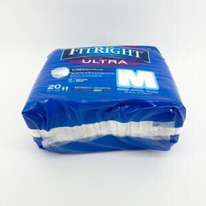 Brand new sealed pack of FitRight Ultra Incontinence Underwear in size Medium. The pack contains 20 disposable underwear designed for waist sizes 28”-40” (71-102 cm), providing heavy absorbency for reliable protection. Ideal for both men and women, these underwear feature soft anti-leak guards and a comfortable, secure fit.