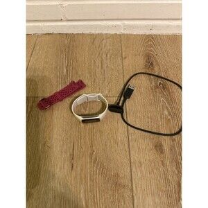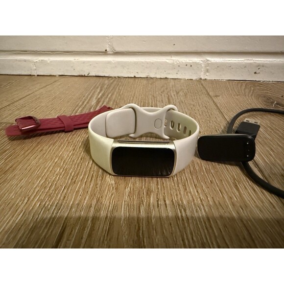 Stylish Fitbit smartwatch featuring a white band and black display. Perfect for tracking fitness and staying connected.