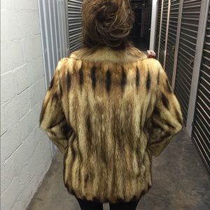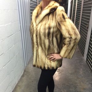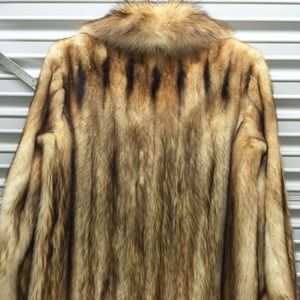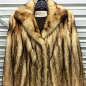 Pre-owed Fitch Fur. Size Small. (The photo of the jacket was take me; I am a size 6 and,5,5" ). The petals are in very good condition, as is the lining- there are Initials sewn on the left interior breast area, we can remove them upon request, prior to shipping . There no dried out areas of fur or seam separations. The fur is rust/brown and tan.
