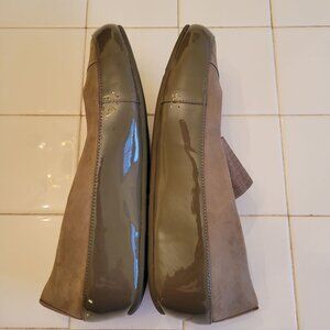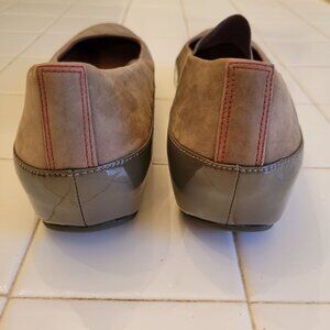 • Olive Nubuck Leather with Gray Patent Platform Wedges