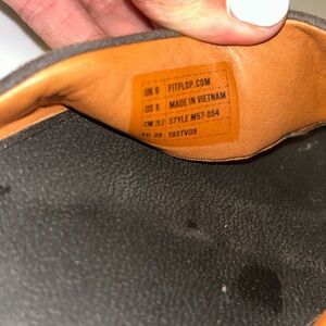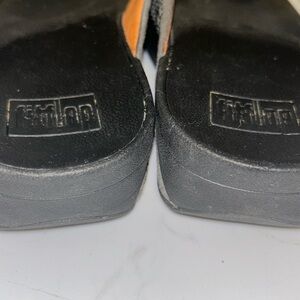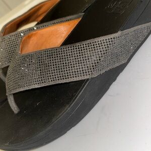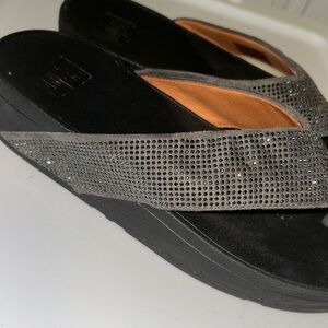 Experience the perfect blend of style and comfort with Fitflop's sandals, featuring a sparkling silver strap with intricate embellishments. The sleek black footbed ensures all-day comfort, making these sandals ideal for any occasion.