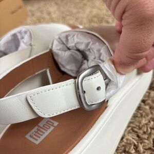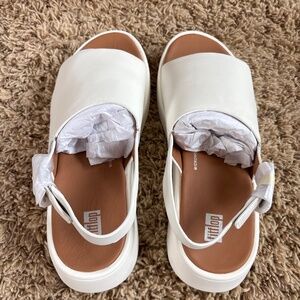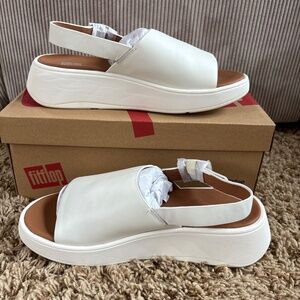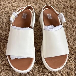 Platform leather sandals, with the back strap and buckle from FitFlop. Brand new, in the box. Didn’t even take the paper off the buckle.