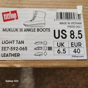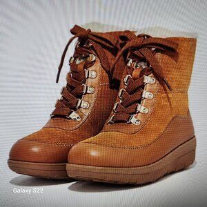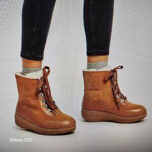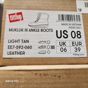 Fitflop Leather Mukluks Iii Tan Boots. NIB. Size: Various. No rips/stains/scuffs/tears/peeling. NIB/Original box/packaging. Boxes are near perfect. Boots are perfect. No flaws. Smoke free home. No odors. All offers are welcome. Thank you! Our little lace-up Mukluks are like a hug for your feet. Featuring a thick, fluffy, curly shearling lining and unbelievable underfoot cushion, thanks to the lightweight version of our bio mechanist-developed triple-density Microwobbleboard™ midsoles. In rich suede, with curved leather panels, zig zag stitching, and shiny metal D-ring eyelets (for a dash of hiker style). Equally good for shopping jaunts/country walks, they're unbeatable for that sheer 'snug' factor. Scotchgard™ protected.
