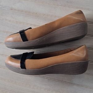 FitFlop Women's Leather Two-Tone Loafers. It is a tan or camel-colored leather flat with a black toe and a black patent strap.