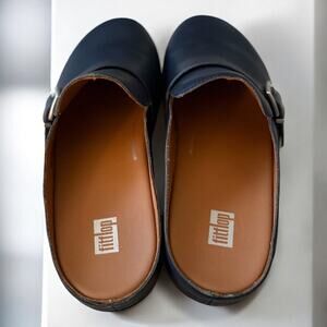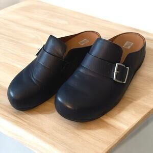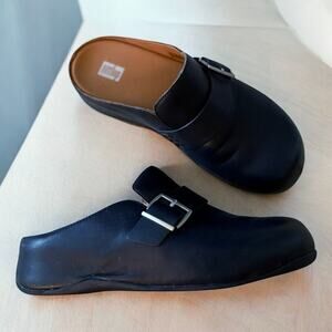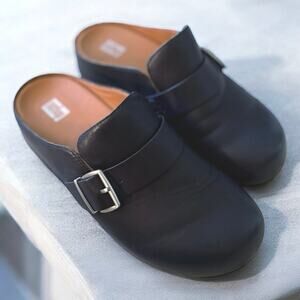 Sleek black leather loafers. Comfortable and stylish. Features a buckle detail.