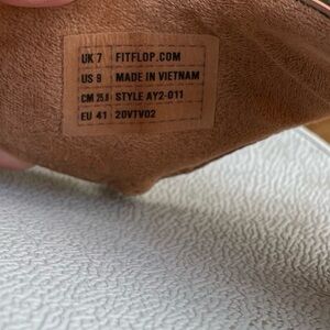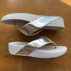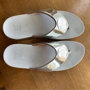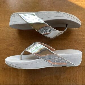 Elegant silver leather sandals by Fitflop. Ergonomically engineered to help optimize your body's alignment, natural movement & energy. Comfort sandals in a pretty silver color with logo accent. Gently preowned with light signs of wear. Please see photos for details.