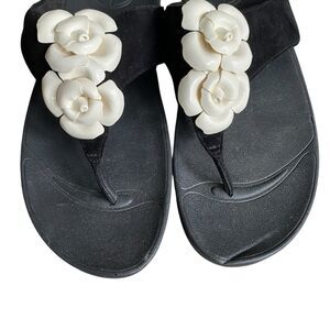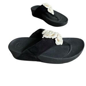 Fitflop Thong Sandals 7M EU 38 Black Suede White Flower Platform Comfort Slide. They are in great pre-owned condition. The toe part of one shoe has minor deformation from storage. It's hardly noticeable. Please make sure you checked on photos for the details.