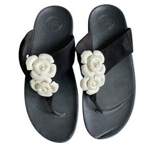 Fitflop Thong Sandals 7M EU 38 Black Suede White Flower Platform Comfort Slide