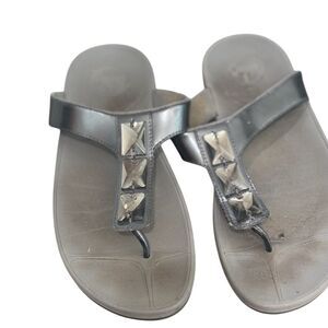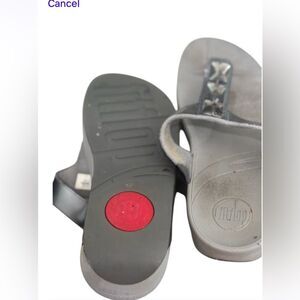 These are preowned silver colored fitflops. They feature large rhinestones and a wedge wobble board sole. They are designed for comfort and versatility. A casual shoe or a dressy one depending on the outfit. These shoes have some scratches to the gems and dirt discoloration in the footbeds. No other holes stains or flaws.